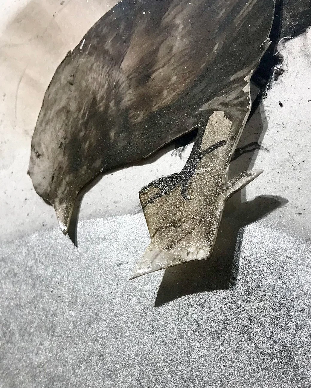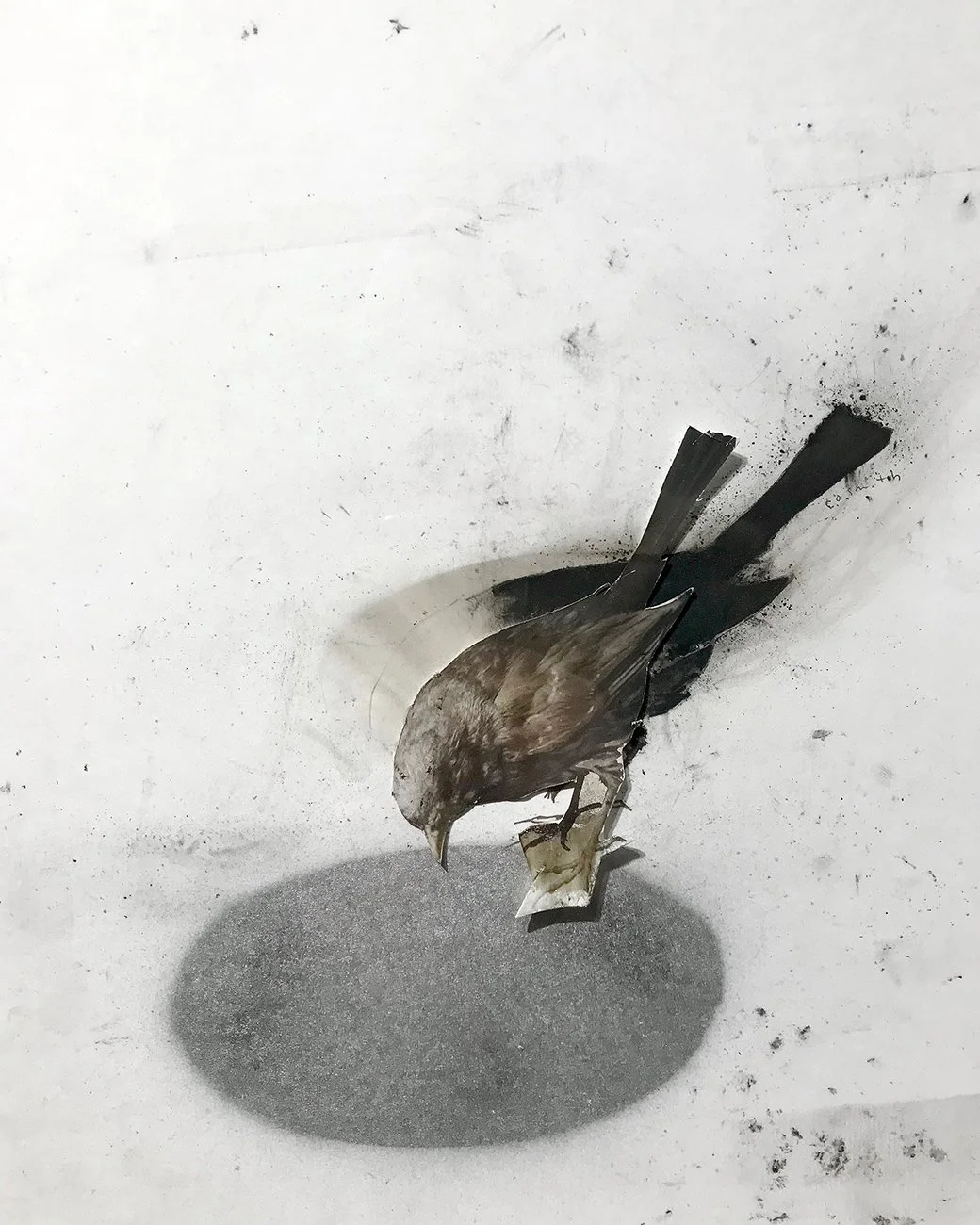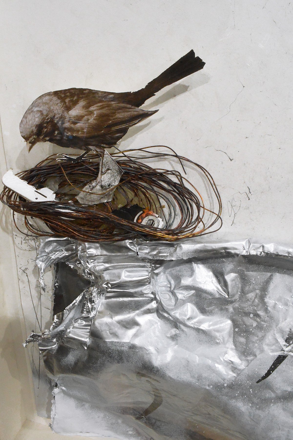 This series depicts wildlife dealing with and being distracted by human industrial residue, and are symbolic of our own tech addictions. Mixed media: Charcoal, graphite, photography, acrylic and oil based paints, found materials, discarded electronic parts.