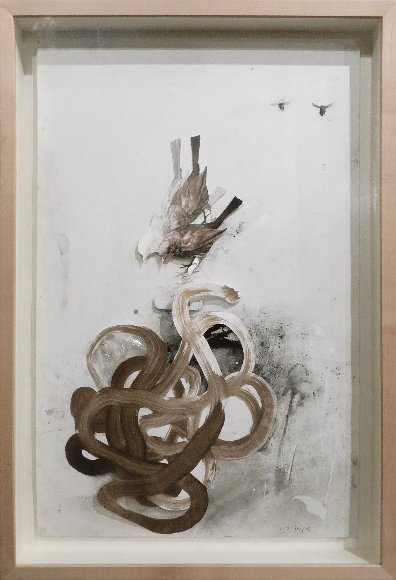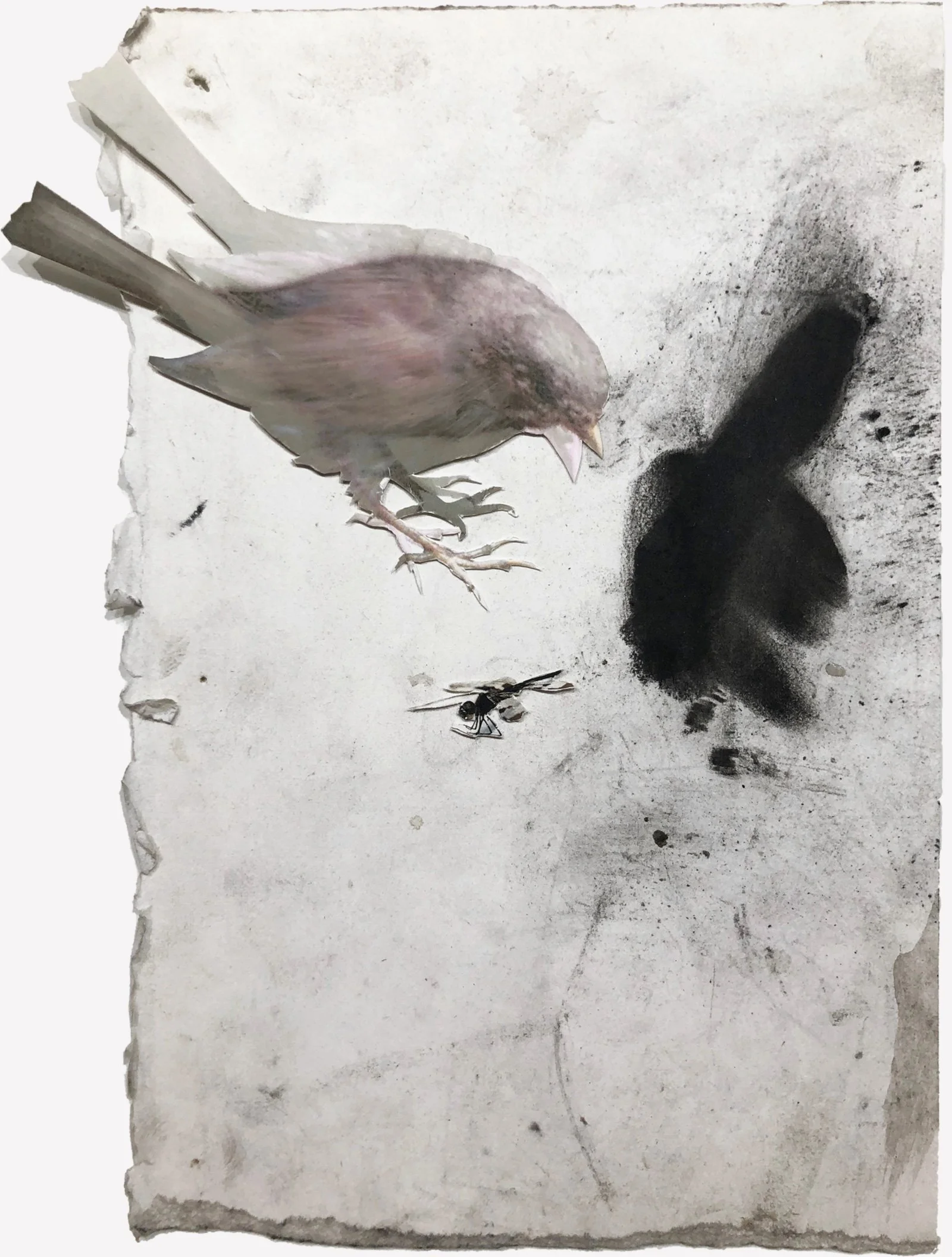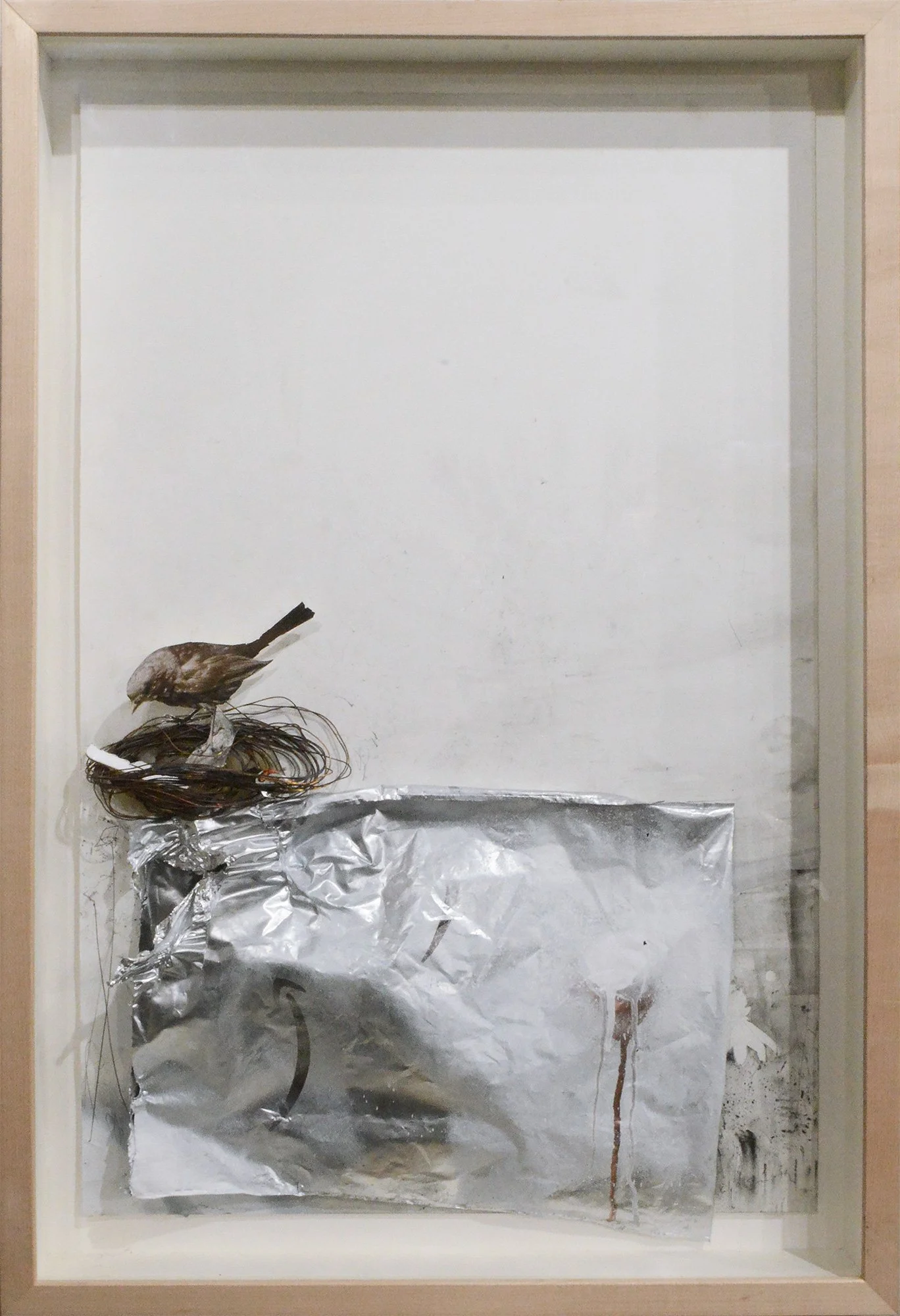 This series depicts wildlife dealing with and being distracted by human industrial residue, and are symbolic of our own tech addictions. Mixed media: Charcoal, graphite, photography, acrylic and oil based paints, found materials, discarded electronic parts.